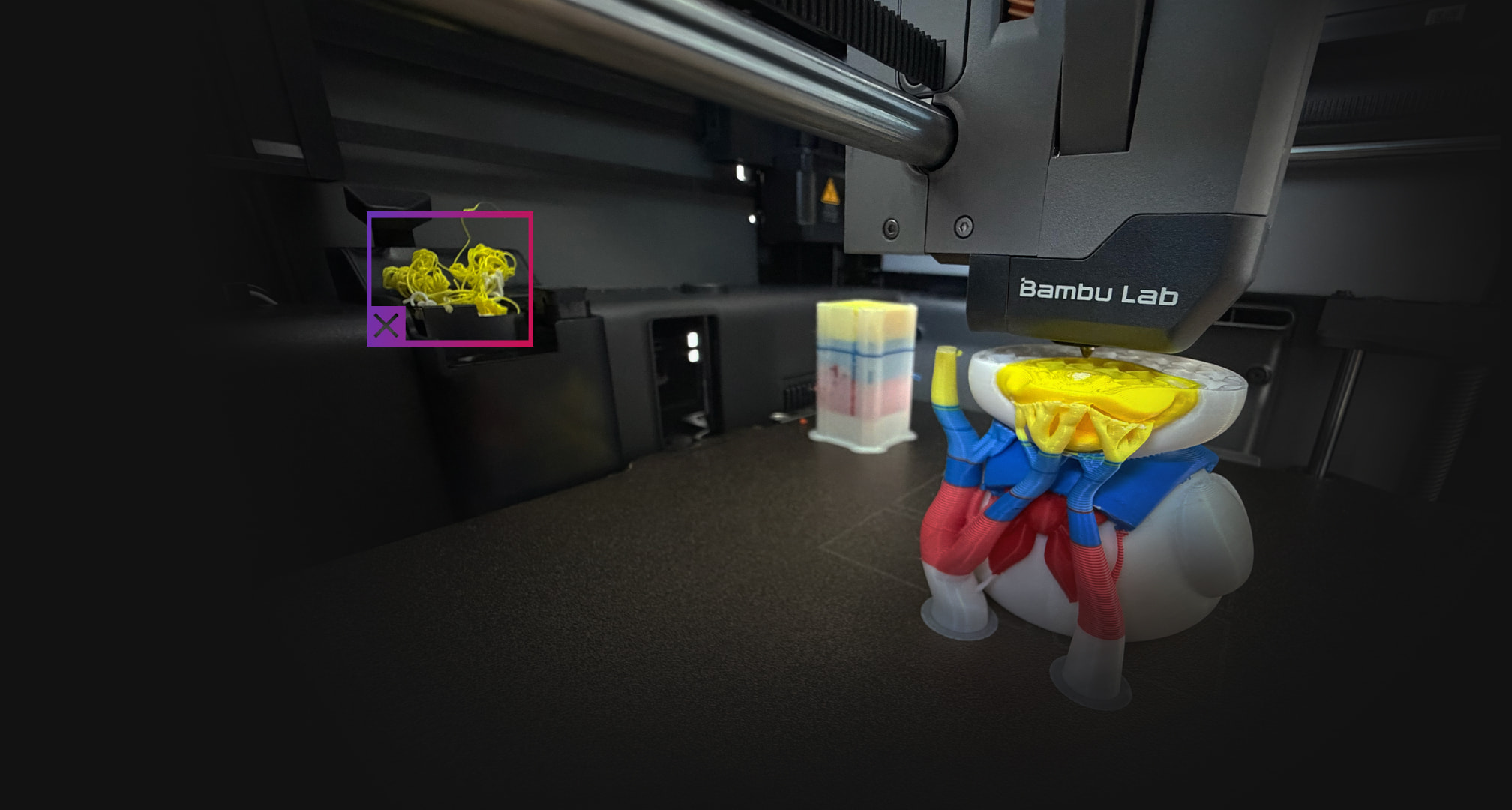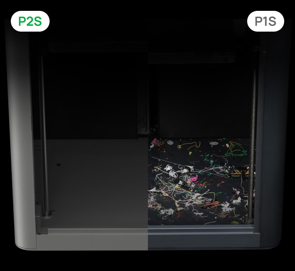 。打印低温耗材时放心关上 P2S 的舱门,而无需担心悬垂质量问题或堵头。
